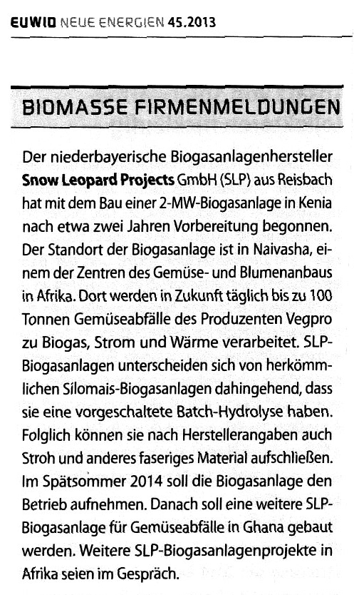 the bavarian producer of biogas plant Snow Leopard Projects GmbH / Reisbach started to build a 2-MW-biogas plant in Kenia after two years preparation time.